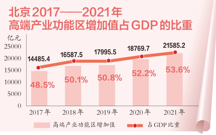 重點(diǎn)功能區(qū)呈現(xiàn)集聚效應(yīng)。中關(guān)村國家自主創(chuàng)新示范區(qū)等高端產(chǎn)業(yè)功能區(qū)占據(jù)全市經(jīng)濟(jì)總量的半壁江山,2021年實(shí)現(xiàn)增加值2.2萬億元,占全市GDP的53.6%,比2016年提高5.3個(gè)百分點(diǎn)。