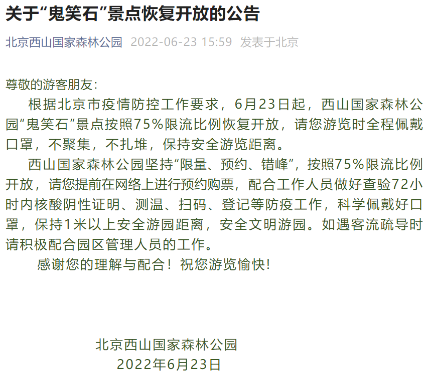 央廣網(wǎng)北京6月23日消息 據(jù)北京西山國(guó)家森林公園微信公眾號(hào)消息,根據(jù)北京市疫情防控工作要求,自6月23日起,西山國(guó)家森林公園“鬼笑石”景點(diǎn)按照75%限流比例恢復(fù)開(kāi)放。