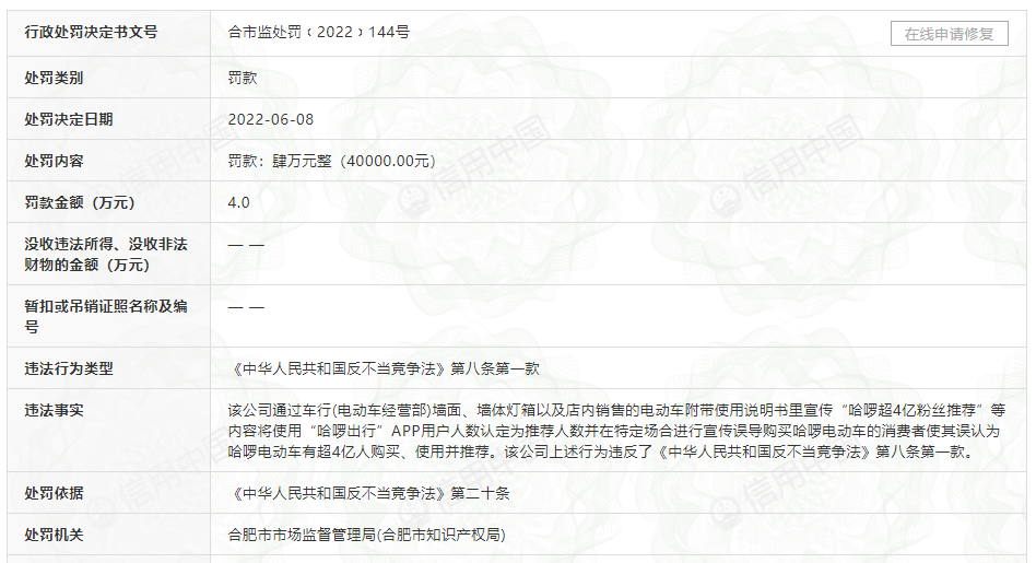 哈啰關(guān)聯(lián)公司因誤導(dǎo)消費者被罰4萬元:宣稱超4億粉絲推薦