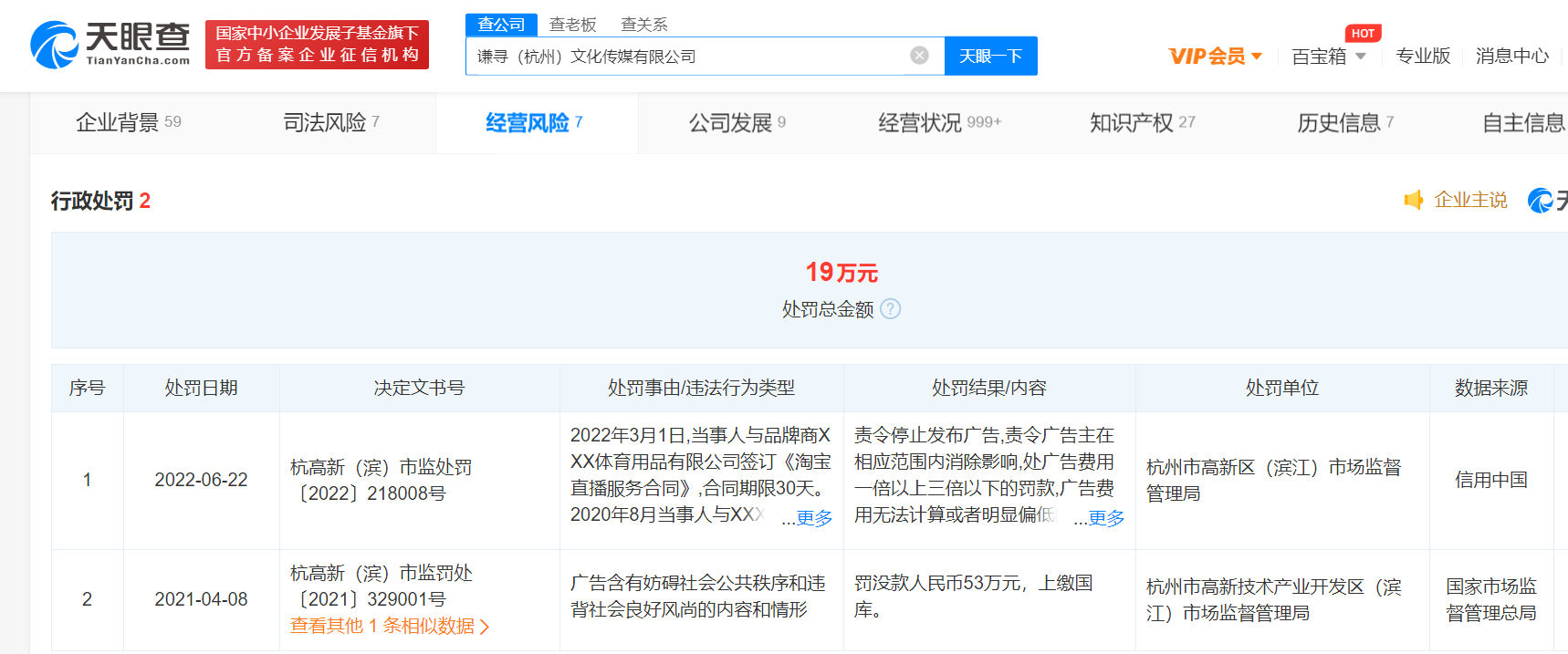 央廣網(wǎng)北京6月27日消息(記者 楊柳青) 近日,謙尋(杭州)文化傳媒有限公司因違反廣告法,被杭州市高新區(qū)(濱江)市場監(jiān)督管理局罰款19萬元。