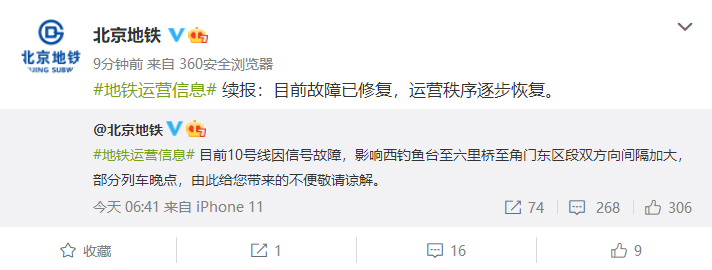 北京地鐵:10號(hào)線故障已修復(fù),運(yùn)營秩序逐步恢復(fù)