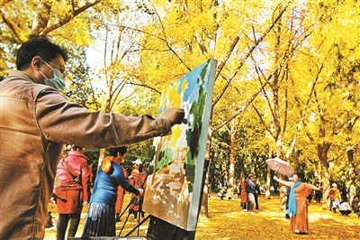 每年一進(jìn)入11月,地壇公園內(nèi)的200余株銀杏樹就被“染成”金黃色,形成“紅墻金葉”這一獨特景觀,成為京城秋日中一抹靚麗的風(fēng)景。11月1日上午,地壇公園內(nèi)“園林四季 秋之華彩”金秋銀杏活動吸引了不少青年藝術(shù)家、廣大藝術(shù)愛好者和游園群眾參與進(jìn)來。陸愛民、李菲、賈見罡、李玉娥、王世高、徐佳、劉玉芬7位畫家相約而來,在地壇公園內(nèi)用手中的畫筆定格美景、描繪金秋。