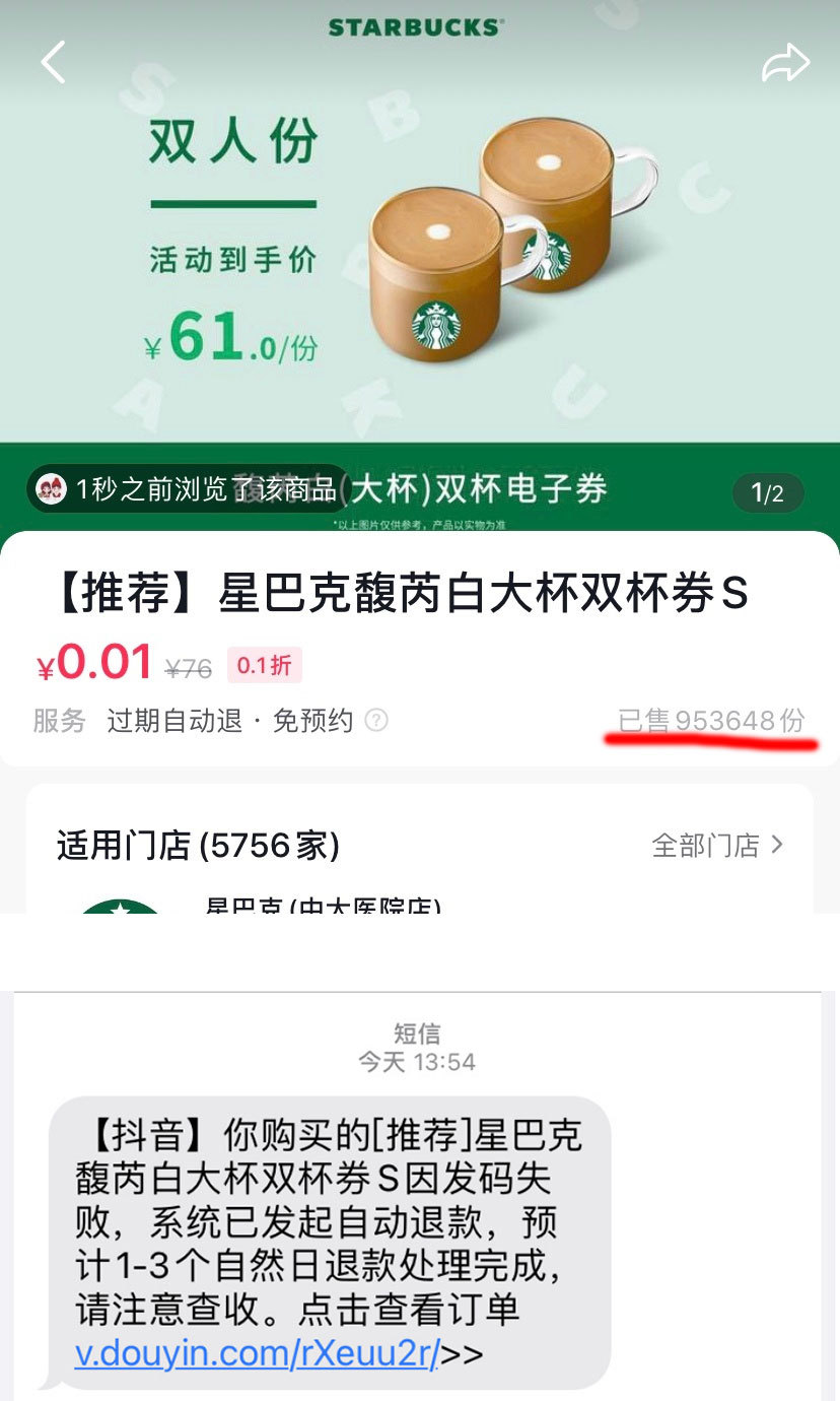 央廣網(wǎng)記者注意到,23日有多名網(wǎng)友在社交平臺微博反饋,星巴克近日在某平臺推出0.01元購2杯馥芮白咖啡券團(tuán)購活動(dòng),賣出95萬多單。但是不少消費(fèi)者表示搶券后,發(fā)現(xiàn)無法兌換,被星巴克自動(dòng)退款了。