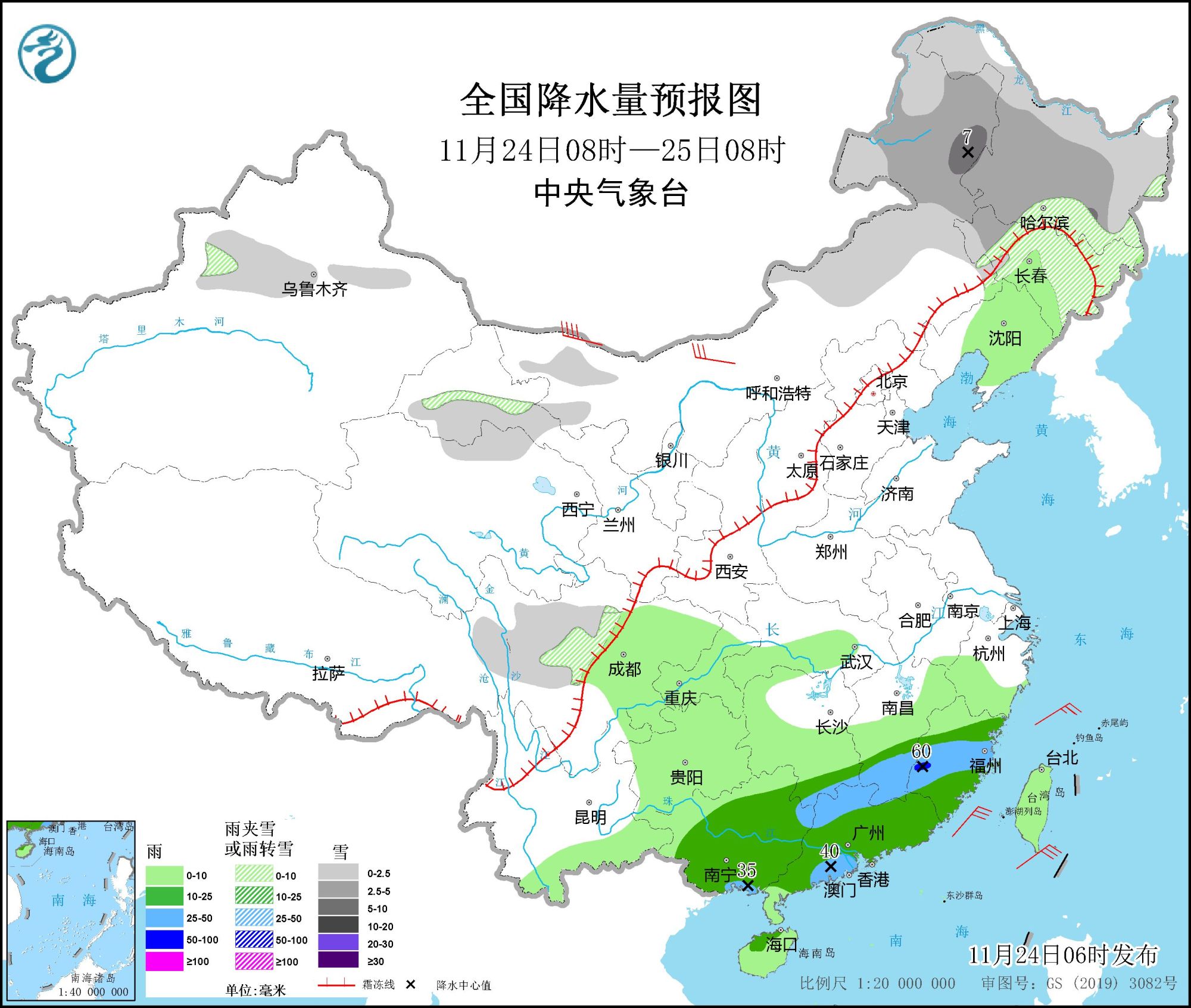 此外,預(yù)計(jì)11月24日08時(shí)至25日08時(shí),內(nèi)蒙古東部、東北地區(qū)、新疆沿天山地區(qū)、甘肅河西、川西高原等地部分地區(qū)有小到中雪或雨夾雪,其中,內(nèi)蒙古東北部局地有大雪(5~7毫米)。江南南部、華南大部等地部分地區(qū)有中到大雨,局地暴雨(50~60毫米)。內(nèi)蒙古西部部分地區(qū)有5~7級(jí)風(fēng)。