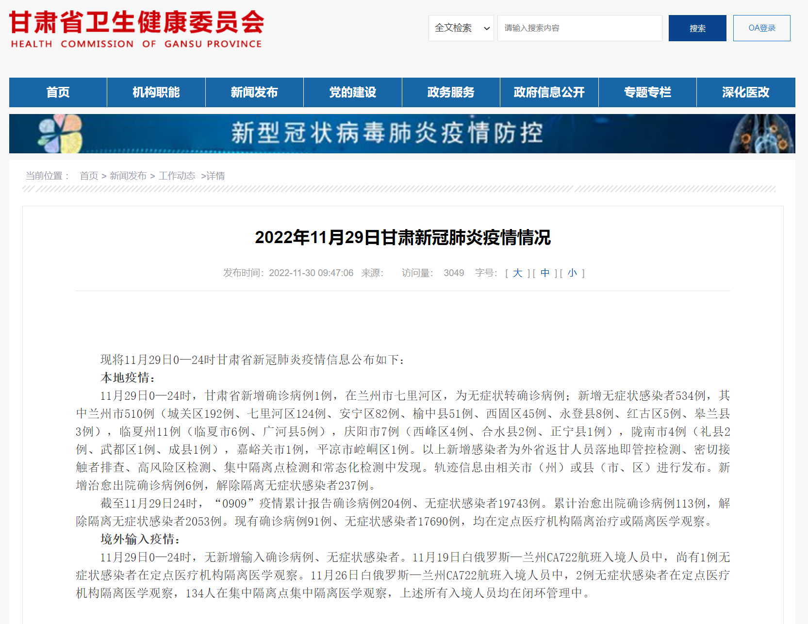 11月29日甘肅新增確診病例1例,無(wú)癥狀感染者534例
