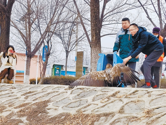 今年農(nóng)歷大年初三晚上,懷柔區(qū)寶山鎮(zhèn)牛圈子村村民在本村發(fā)現(xiàn)了一只大鳥,疑似老鷹,當(dāng)時這只大鳥已無法正常飛行,村民當(dāng)即報警求助。懷柔區(qū)園林綠化局野生動植物保護(hù)管理中心工作人員得知后,第一時間與村民取得聯(lián)系,并確認(rèn)這只大鳥為國家一級保護(hù)動物白尾海雕。第二天,這只白尾海雕由北京市陸生野生動物救護(hù)中心專業(yè)人員接走進(jìn)行治療。