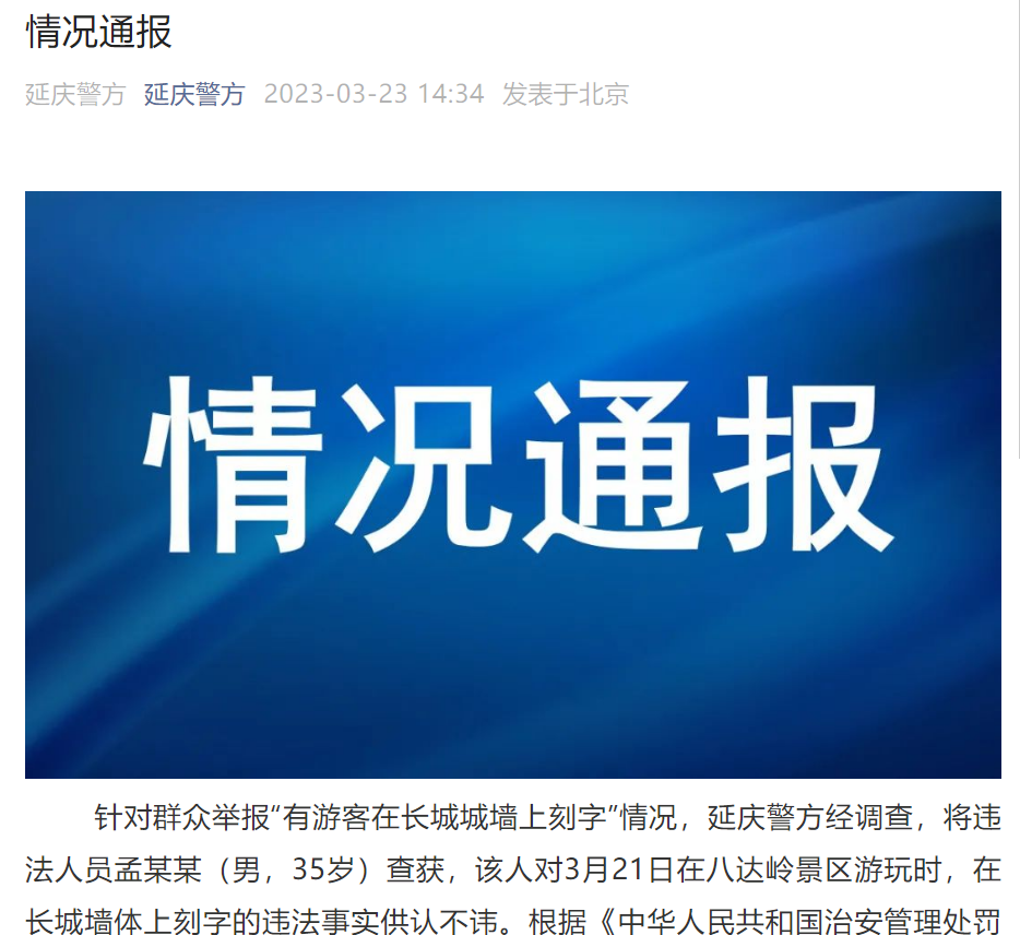 央廣網(wǎng)北京3月23日消息 據(jù)延慶警方微信公眾號(hào)3月23日情況通報(bào), 針對(duì)群眾舉報(bào)“有游客在長城城墻上刻字”情況,延慶警方經(jīng)調(diào)查,將違法人員孟某某(男,35歲)查獲,該人對(duì)3月21日在八達(dá)嶺景區(qū)游玩時(shí),在長城墻體上刻字的違法事實(shí)供認(rèn)不諱。根據(jù)《中華人民共和國治安管理處罰法》有關(guān)規(guī)定,延慶警方已對(duì)孟某某處以行政拘留并處罰款的處罰。