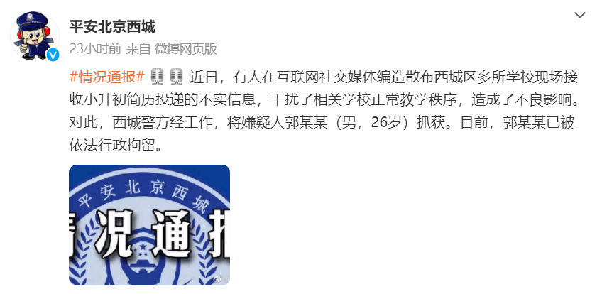 北京西城警方辟謠“多校現(xiàn)場(chǎng)接收小升初簡(jiǎn)歷”