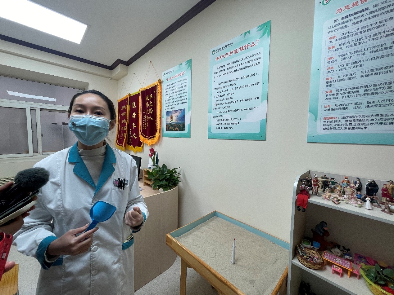 蒲黃榆社區(qū)衛(wèi)生服務(wù)中心安寧療護(hù)社工向記者介紹心理沙盤(pán)