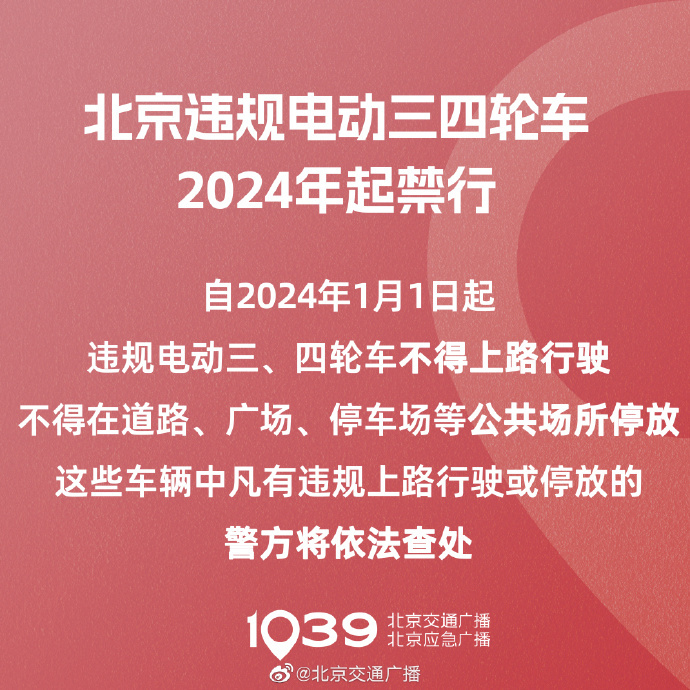 2022年,北京市共發(fā)生違規(guī)電動三、四輪車交通事故131起,死亡138人。市交管局于4月12日再次強調,自2024年1月1日起,違規(guī)電動三、四輪車不得上路行駛,不得在道路、廣場、停車場等公共場所停放。這些車輛中凡有違規(guī)上路行駛或停放的,警方將依法查處。