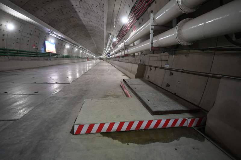 此外,箱涵兩側(cè)分別設(shè)置有管廊與人員應(yīng)急通道,而這些在路面鋪設(shè)完畢后都將藏于路面下方,對(duì)通行者來(lái)說(shuō)完全是無(wú)感的。孫長(zhǎng)松指著路面上的一處蓋有擋板的地方告訴記者,這里就是人員應(yīng)急通道的入口,通車后路面上將設(shè)置用液壓控制的智能蓋板,正常狀態(tài)下,它與路面嚴(yán)絲合縫地貼在一起,在發(fā)生意外情況、需要疏散人員時(shí),它則會(huì)及時(shí)開(kāi)啟。