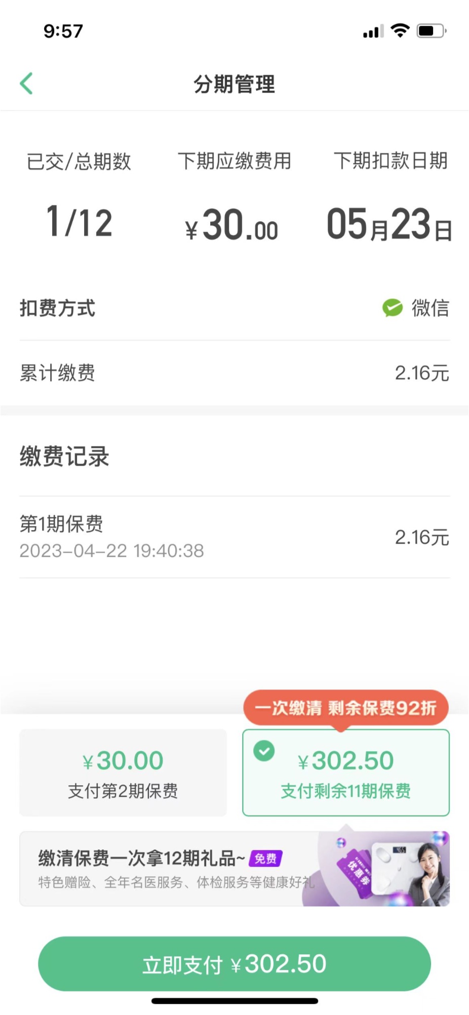 記者在眾安保險App的保單頁面中看到,所購保險名為“眾安百萬醫(yī)療保險2022版”,點擊保單頁中的“去繳費”選項,該保單為期一年,目前累計繳費2.16元,但下期應繳費用已變?yōu)?0元。