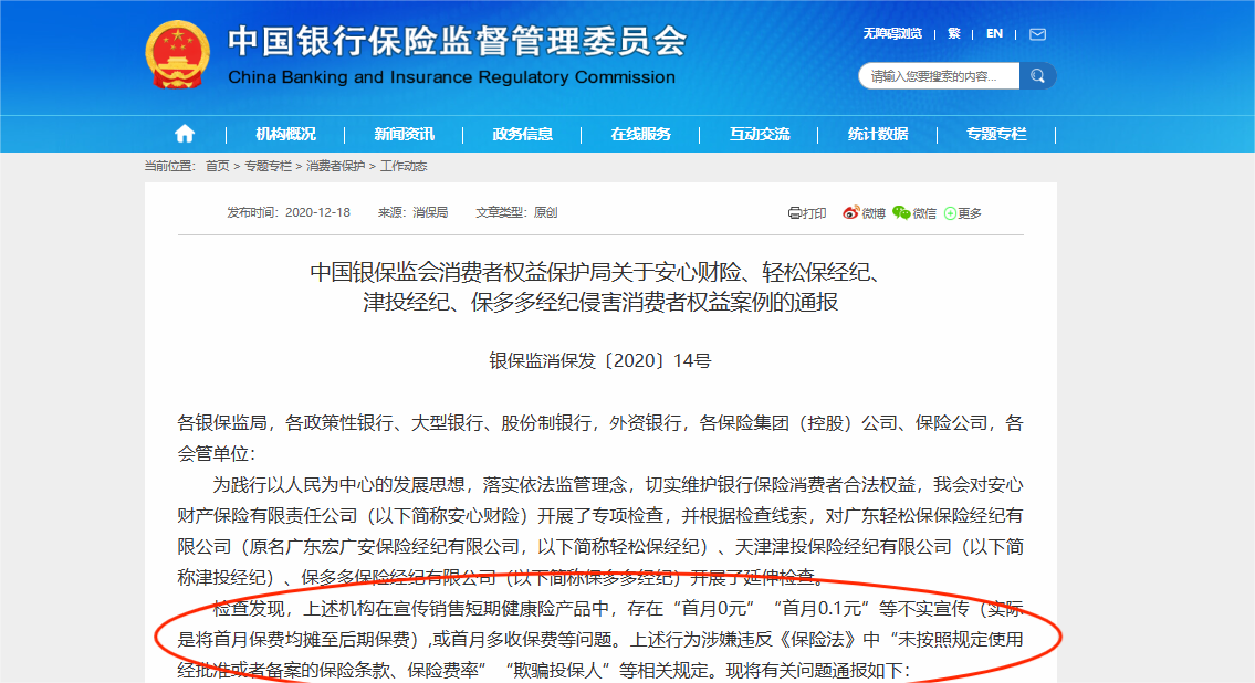 2020年,中國銀保監(jiān)會消費者權益保護局發(fā)布關于安心財險、輕松保經(jīng)紀、津投經(jīng)紀、保多多經(jīng)紀侵害消費者權益案例的通報。通報稱檢查發(fā)現(xiàn),上述機構在宣傳銷售短期健康險產(chǎn)品中,存在“首月0元”“首月0.1元”等不實宣傳(實際是將首月保費均攤至后期保費),或首月多收保費等問題。上述行為涉嫌違反保險法中“未按照規(guī)定使用經(jīng)批準或者備案的保險條款、保險費率”“欺騙投保人”等相關規(guī)定。