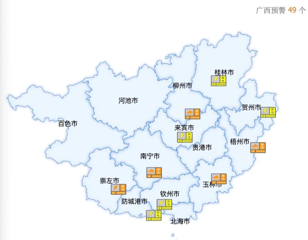 今天(24日),廣西南寧、梧州、玉林等地相繼發(fā)布暴雨、雷電等各類(lèi)氣象預(yù)警信息,提醒公眾注意做好相關(guān)防范工作。截至24日上午9點(diǎn)30分,全區(qū)各類(lèi)預(yù)警信息49個(gè)。