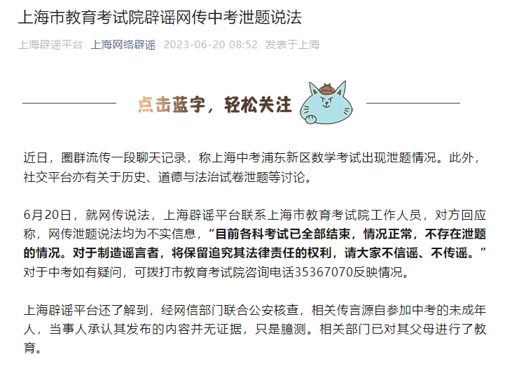 上海市教育考試院辟謠網(wǎng)傳中考泄題說(shuō)法