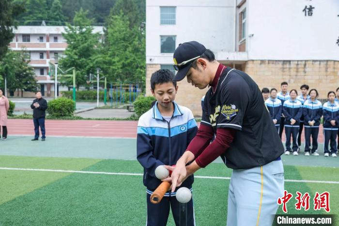 今年4月,臺青宋奇軒在北京合伙創(chuàng)辦“新世代棒球俱樂部”。圖為宋奇軒在四川省青川縣為當?shù)貙W校開展公益棒球課項目。(受訪者供圖)
