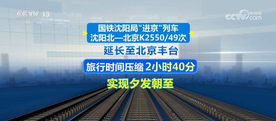 此次調(diào)圖,國鐵沈陽局“進(jìn)京”列車沈陽北—北京K2550/49次延長(zhǎng)至北京豐臺(tái),旅行時(shí)間壓縮2小時(shí)40分,實(shí)現(xiàn)夕發(fā)朝至。