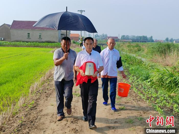7月9日晨,劉德文手捧去臺老兵唐步良的骨灰,準(zhǔn)備將其安葬在江蘇鹽城市射陽縣興橋鎮(zhèn)青華村青華公墓。這里是唐步良父母的長眠之地?!≈行律缬浾?谷華 攝