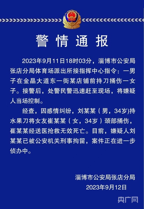 央廣網(wǎng)淄博9月12日消息(記者程立龍)9月12日,山東淄博警方發(fā)布通報稱,一男子當街行兇致女友死亡,男子已被公安機關刑事拘留。通報原文如下: