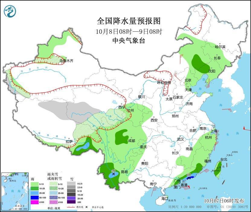 圖1 全國降水量預報圖(10月7日08時-8日08時)