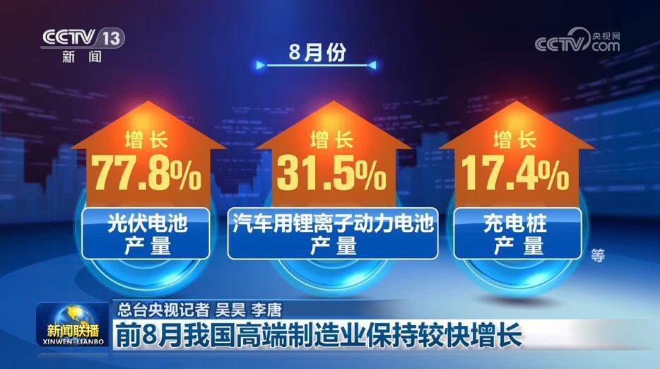8月份,主要新能源產(chǎn)品兩位數(shù)增長,新能源汽車產(chǎn)量同比增長13.8%,帶動光伏電池、汽車用鋰離子動力電池、充電樁等產(chǎn)品產(chǎn)量分別增長77.8%、31.5%、17.4%;新材料產(chǎn)品生產(chǎn)保持高速增長,太陽能工業(yè)用超白玻璃、多晶硅、單晶硅等產(chǎn)品產(chǎn)量分別增長63.3%、84.6%、79.9%。