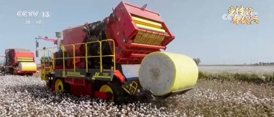 這幾年,新疆絕大部分地區(qū)都已經(jīng)實現(xiàn)了機械化采棉。棉花采收打包一體機,除了自動采棉之外,還有打包的功能,當(dāng)?shù)厝私o它取了個特別形象的名字叫“下蛋機”。當(dāng)裝棉花的車廂裝滿后,它的尾部會自動吐出一個大棉包,這個棉包用金黃色包裝膜包裹著,從空中俯瞰像是一枚巨大的“金蛋”,既干凈又方便后續(xù)運輸。這些“下蛋機”是這兩年最新上市的我國自主研發(fā)、自主生產(chǎn)的機器。
