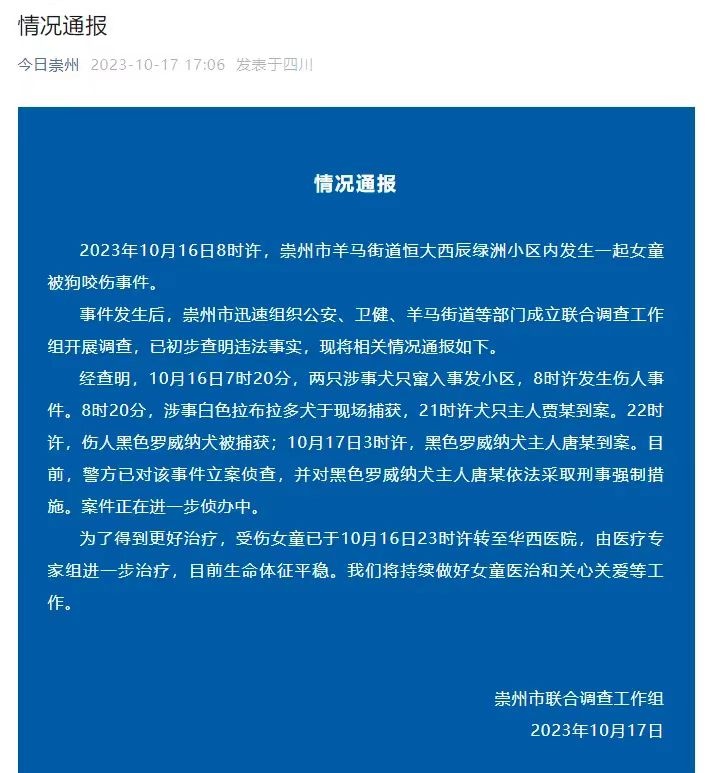 10月17日,四川崇州聯(lián)合工作組發(fā)布通報稱,經(jīng)查明,10月16日7時20分,兩只涉事犬只竄入事發(fā)小區(qū),8時許,發(fā)生傷人事件。8時20分,涉事白色拉布拉多犬于現(xiàn)場捕獲,21時許犬只主人賈某到案。22時許,傷人黑色羅威納犬被捕獲;10月17日3時許,黑色羅威納犬主人唐某到案。
