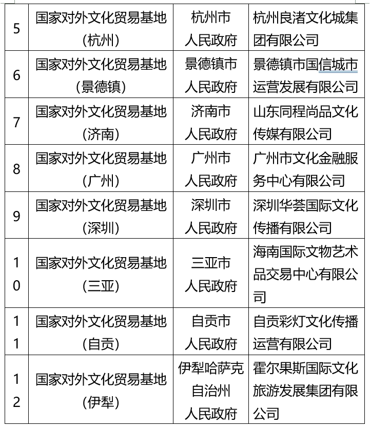 央廣網(wǎng)北京10月19日消息 據(jù)文化和旅游部網(wǎng)站消息,為全面貫徹落實(shí)黨的二十大精神,推動文化和旅游對外貿(mào)易高質(zhì)量發(fā)展,根據(jù)《文化和旅游部辦公廳 商務(wù)部辦公廳關(guān)于開展新一批國家對外文化貿(mào)易基地申報(bào)工作的通知》(辦產(chǎn)業(yè)發(fā)〔2022〕124號),在各?。▍^(qū)、市)、新疆生產(chǎn)建設(shè)兵團(tuán)推薦申報(bào)基礎(chǔ)上,文化和旅游部、商務(wù)部確定新一批國家對外文化貿(mào)易基地(共12家,含復(fù)核通過2家),現(xiàn)予公布。