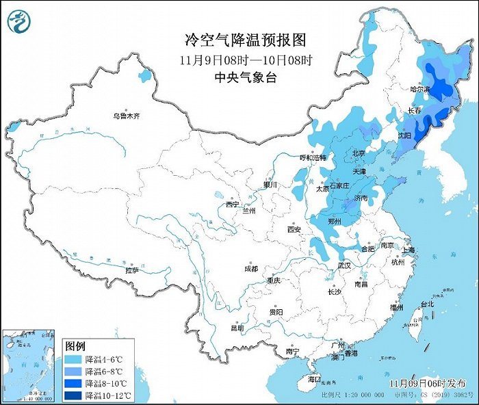 受冷空氣影響,9-13日,中東部地區(qū)將自北向南先后出現(xiàn)大風(fēng)降溫天氣,大部地區(qū)過程累計降溫幅度有6~10℃,黑龍江東部、吉林東部以河南、湖北、湖南、貴州和廣西等地的部分地區(qū)降溫可達12℃以上;南方地區(qū)強降溫主要出現(xiàn)在10-13日;13日前后最低氣溫0℃線位于山東中南部-河南北部一線,江淮地區(qū)最低氣溫5℃左右。