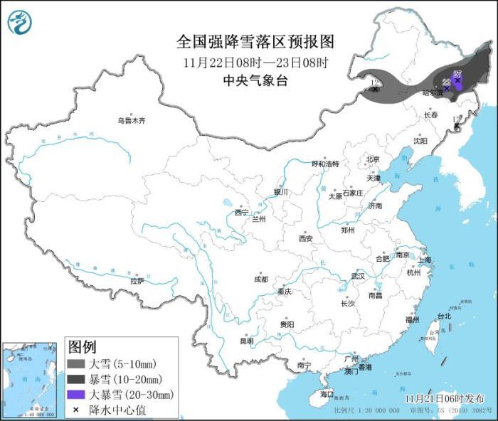 11月22日08時至23日08時,內(nèi)蒙古東部、黑龍江中東部、吉林長白山區(qū)等地部分地區(qū)有大到暴雪,黑龍江中部偏南地區(qū)局地有大暴雪(20~27毫米),上述部分地區(qū)新增積雪深度6~15厘米,局地20厘米左右。