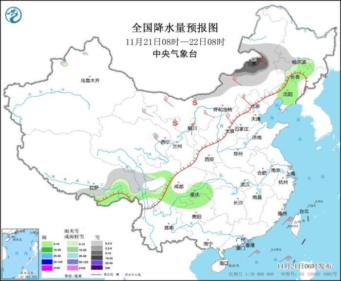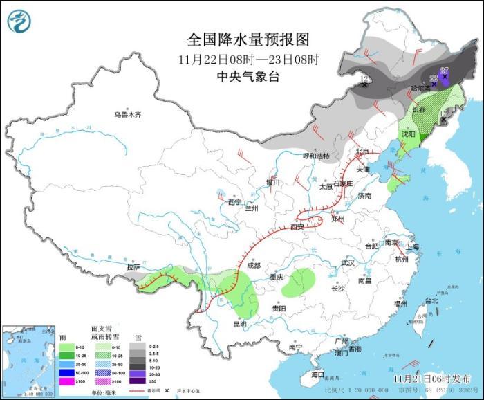 其中,11月21日08時至22日08時,內(nèi)蒙古東部部分地區(qū)有大雪,局地有暴雪(10~12毫米),上述部分地區(qū)新增積雪深度3~8厘米。