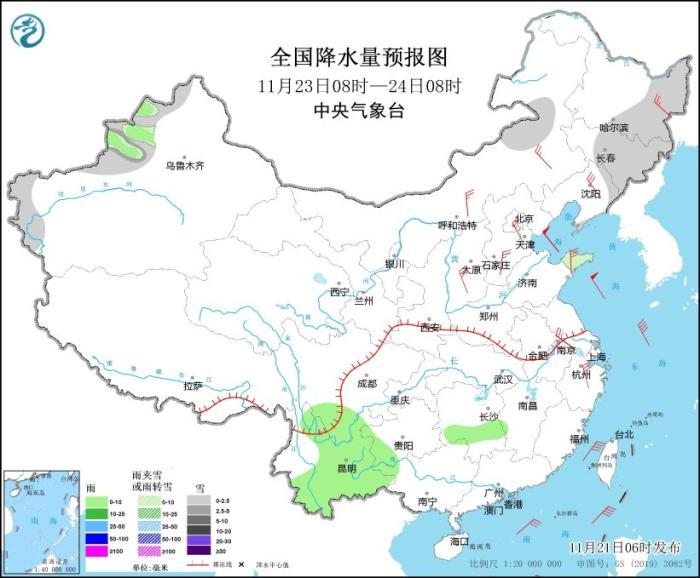 11月23日08時至24日08時,新疆西部、內(nèi)蒙古東部、東北地區(qū)中東部、山東半島等地部分地區(qū)有小雪或雨夾雪,局地有中雪。湖南南部、四川南部、云南大部等地部分地區(qū)有小雨。內(nèi)蒙古中東部、東北地區(qū)大部、華北大部、山東半島、江南東部等地部分地區(qū)有4~6級風(fēng)(見圖8)。