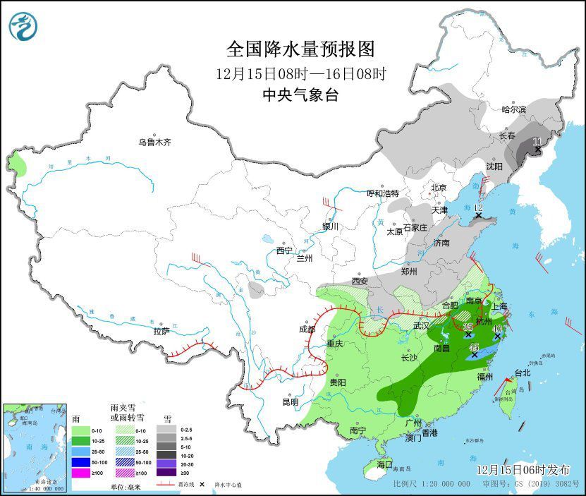 12月15日08時至16日08時,西北地區(qū)東南部、內蒙古東部、東北地區(qū)中東部和南部、黃淮、江淮大部、江漢等地部分地區(qū)有小雪或雨夾雪,其中,吉林東部、遼寧東北部、山東北部等地部分地區(qū)有中到大雪,局地暴雪(10~12毫米)。江南、西南地區(qū)東部、華南、臺灣島等地部分地區(qū)有小到中雨,其中,江西北部、浙江中南部、福建北部等地部分地區(qū)有大雨(25~45毫米)。內蒙古西南部、遼東半島、江蘇北部等地部分地區(qū)有4~6級風,其中,青海南部部分地區(qū)有6~7級風。