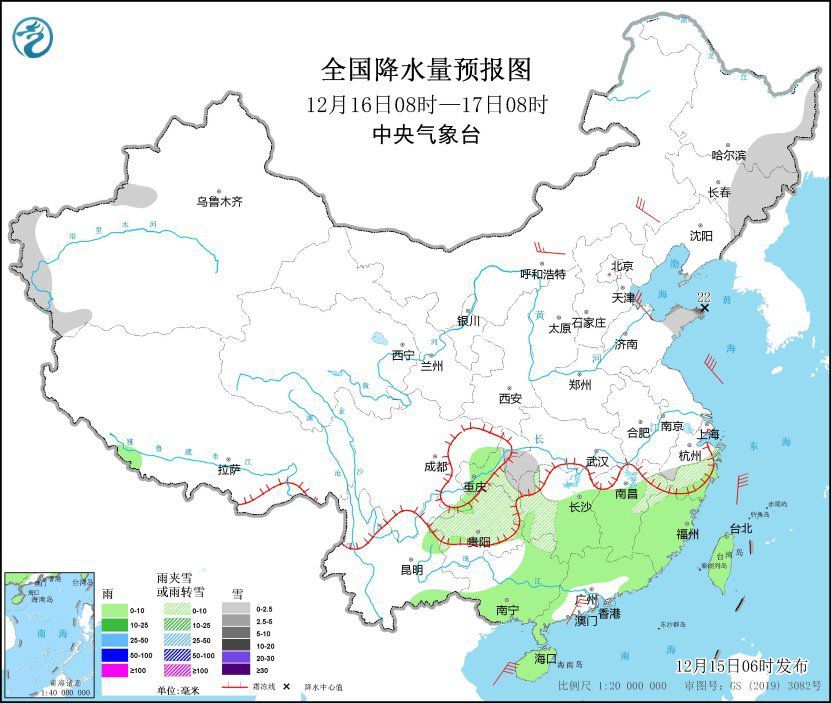 12月16日08時至17日08時,新疆南疆西部山區(qū)、東北地區(qū)東部、山東半島、湖南西部、浙江中部、貴州等地部分地區(qū)有小雪或雨夾雪,其中,山東半島等地部分地區(qū)有中到大雪,局地暴雪或大暴雪(20~22毫米)。湖南東部和南部、江西大部、浙江南部、福建、華南大部、臺灣島等地部分地區(qū)有小雨。內蒙古中東部、山東北部、廣東西南部沿海等地部分地區(qū)有4~6級風。