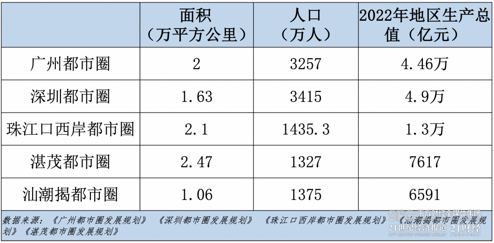 “都市圈是開放的‘圈’,是市場(chǎng)聯(lián)系和社會(huì)分工更密集的概念?!标慀櫽钕蛴浾弑硎?,都市圈的提出是為了協(xié)調(diào)城鄉(xiāng)發(fā)展,通過動(dòng)態(tài)調(diào)整規(guī)劃不斷增強(qiáng)都市圈新內(nèi)涵,將釋放廣東省區(qū)域經(jīng)濟(jì)發(fā)展的新質(zhì)生產(chǎn)力。據(jù)公開數(shù)據(jù)顯示,2022年,廣州都市圈地區(qū)生產(chǎn)總值4.46萬億元,深圳都市圈4.9萬億元,珠江口西岸都市圈1.3萬億元,汕潮揭都市圈7617億元,湛茂都市圈6591億元,合計(jì)12.08萬億元。