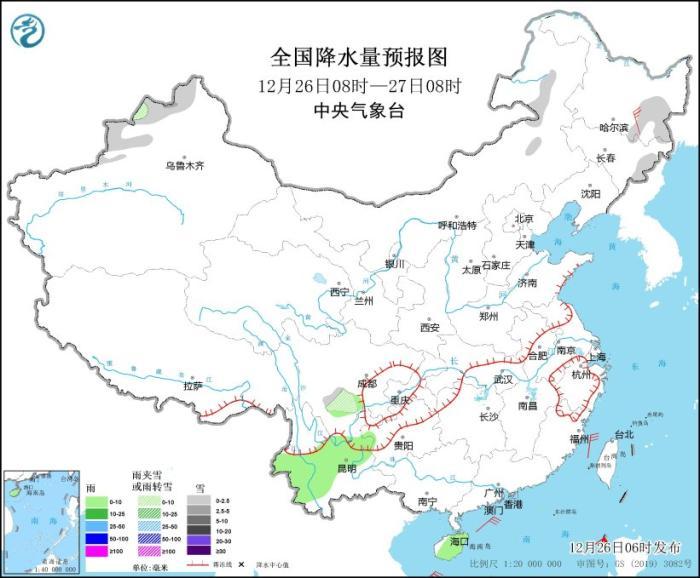 12月26日08時(shí)至27日08時(shí),內(nèi)蒙古東北部、黑龍江東部、吉林東部、新疆北部、四川南部等地部分地區(qū)有小到中雪或雨夾雪。四川南部、云南中西部、海南島大部等地部分地區(qū)有小雨。黑龍江東南部部分地區(qū)有4~5級(jí)風(fēng)(見圖1)。