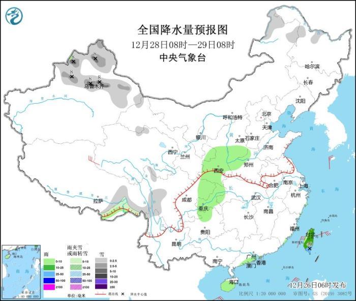 12月28日08時(shí)至29日08時(shí),內(nèi)蒙古東北部、黑龍江西北部、新疆北部、西藏東部等地部分地區(qū)有小雪或雨夾雪,其中,新疆北疆北部和沿天山地區(qū)等地部分地區(qū)有中到大雪(5~8毫米)。西北地區(qū)東部、華北南部、黃淮西部、西南地區(qū)東部、臺(tái)灣島等地部分地區(qū)有小到中雨,其中,臺(tái)灣島等地部分地區(qū)有大雨(25~40毫米)。青海西部部分地區(qū)有5~6級(jí)風(fēng)(見圖3)。