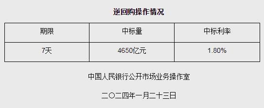 中新網(wǎng)1月23日電 據(jù)央行網(wǎng)站消息,為維護(hù)銀行體系流動(dòng)性合理充裕,2024年1月23日人民銀行以利率招標(biāo)方式開展了4650億元逆回購(gòu)操作,中標(biāo)利率1.80%,期限為7天。具體情況如下: