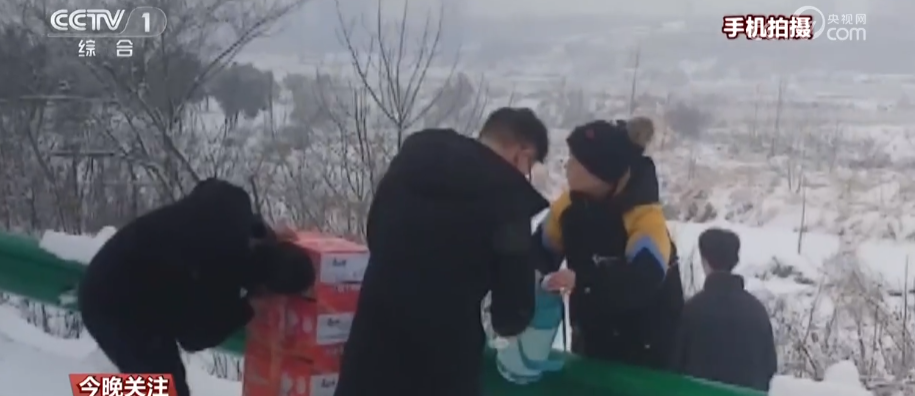 鄧秀枝在當(dāng)?shù)亟?jīng)營一家小賣鋪,老人燒水,兒子打包方便面,孫輩們也一起幫忙,踏著20厘米厚的積雪,一家人爬上了高速路。