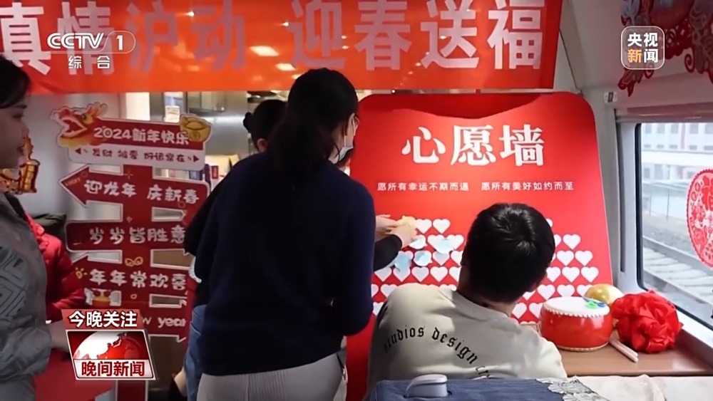 同樣,在青島開(kāi)往上海虹橋的G232次列車(chē)上,列車(chē)工作人員寫(xiě)福字寫(xiě)春聯(lián),提前為旅客送上新春祝福。工作人員還為每一名參加活動(dòng)的旅客,準(zhǔn)備了愛(ài)心形狀的便利貼,寫(xiě)下新年心愿。