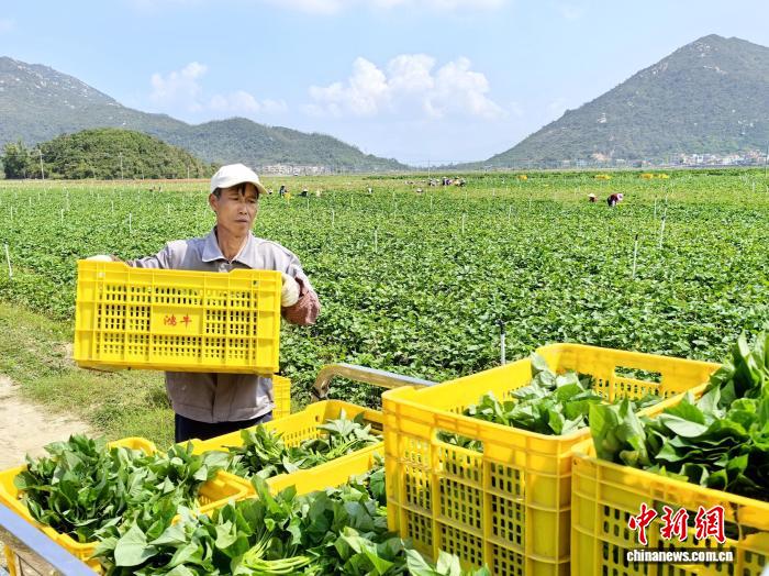 廣東臺山市北陡鎮(zhèn)一村民將剛采摘好的鮮嫩番薯葉搬上車。李曉春 攝