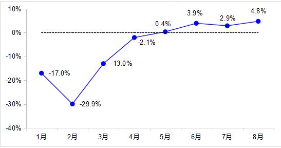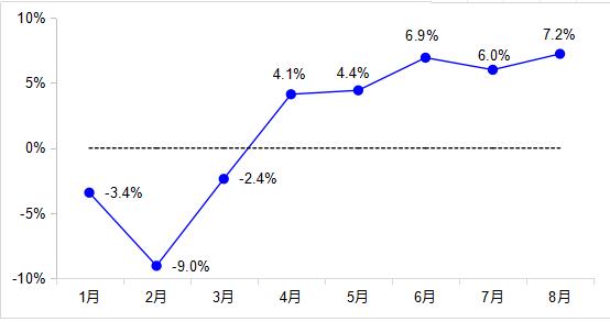 8月,完成貨運(yùn)量43.1億噸,同比增長(zhǎng)4.8%,增速較7月加快1.9個(gè)百分點(diǎn),已恢復(fù)至去年同期水平,其中公路貨運(yùn)量增長(zhǎng)5.5%、水路貨運(yùn)量增長(zhǎng)0.6%。