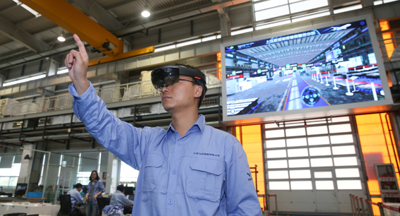 中國(guó)商飛公司總裝制造中心智慧數(shù)控車(chē)間主要承擔(dān)飛機(jī)零部件的研制、生產(chǎn)工作,其產(chǎn)品用于C919大型客機(jī)、ARJ21新支線客機(jī)。圖為工作人員在中國(guó)商飛公司總裝制造中心智慧數(shù)控車(chē)間使用AR眼鏡操控虛擬電子屏幕。新華社記者 丁汀 攝