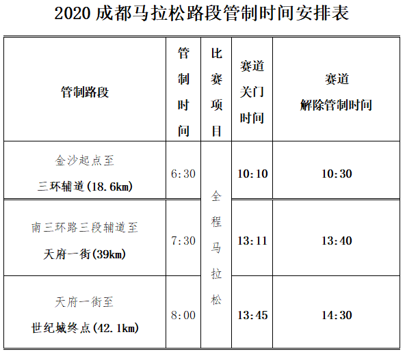 為保障2020成都國(guó)際馬拉松賽事的順利進(jìn)行,組委會(huì)將會(huì)在以下時(shí)段占用部分社會(huì)道路進(jìn)行賽事所需設(shè)施的搭建工作: