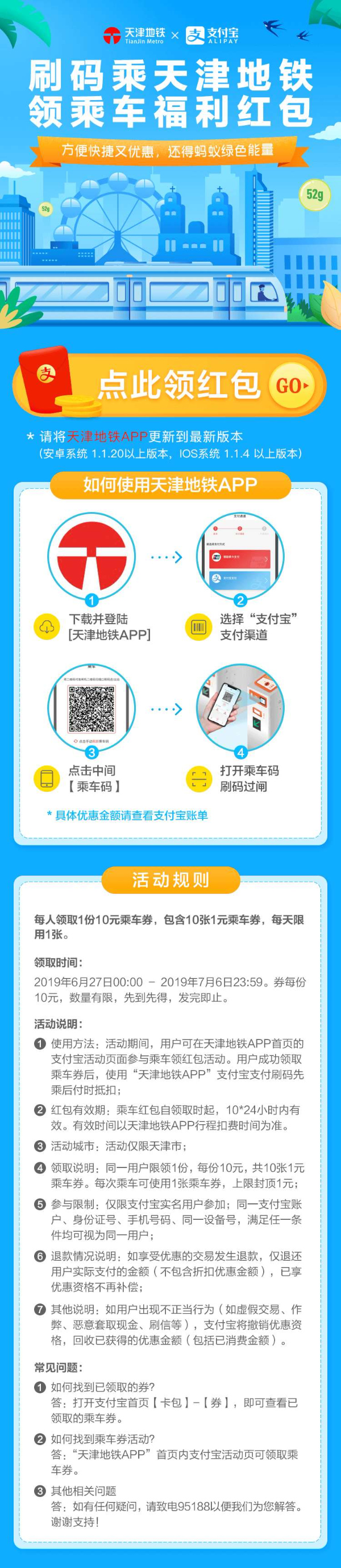 為回饋廣大市民對天津地鐵的支持,天津軌道交通運營集團有限公司與支付寶(中國)網(wǎng)絡技術有限公司聯(lián)合開展出行優(yōu)惠活動,自2019年6月27日至2019年7月6日期間,乘客可在天津地鐵APP或支付寶APP領取支付寶紅包。