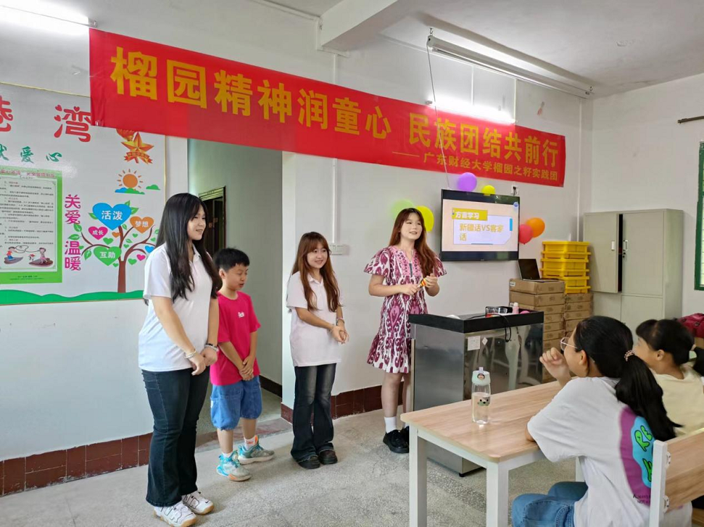 7月7日-7月13日,廣東財經大學“榴園之籽”實踐團組織了廣財大的各民族精英大學生到興寧市開展鄉(xiāng)村支教活動,隊員們教授民族特色歌舞、繪畫手工、武術體育和勞動教育等內容,助力兒童德智體美勞全面發(fā)展。隊員們還為兒童展示各民族的文化特色,讓他們感受到不同民族文化的魅力,并通過講述廣東人民援疆、援藏的事跡,特別是“榴園”校友黃海芬扎根西藏奉獻的事跡,引導孩子們鑄牢中華民族共同體意識。隊員們在支教中傳遞“榴園精神”,鼓勵孩子們一起學習“凝心聚力、團結奮斗”的“榴園精神”,激勵他們勤奮向學、學會感恩,長大成才后回饋家鄉(xiāng)和社會。