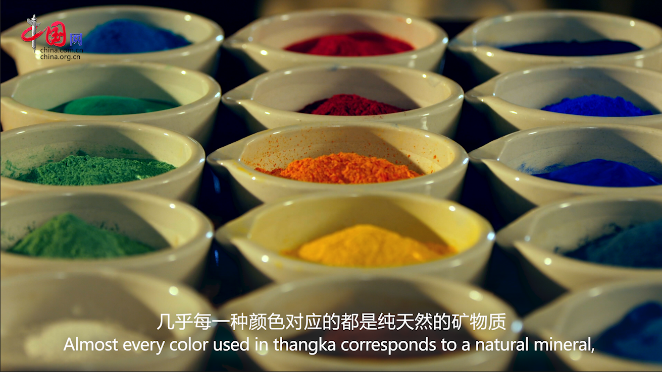 唐卡的色彩為什么璀璨奪目?關(guān)鍵就在這些顏料上,幾乎每一種顏色對(duì)應(yīng)的都是純天然的礦物質(zhì),諸如金、珍珠、綠松石等,精心研磨而成,經(jīng)久而不衰。