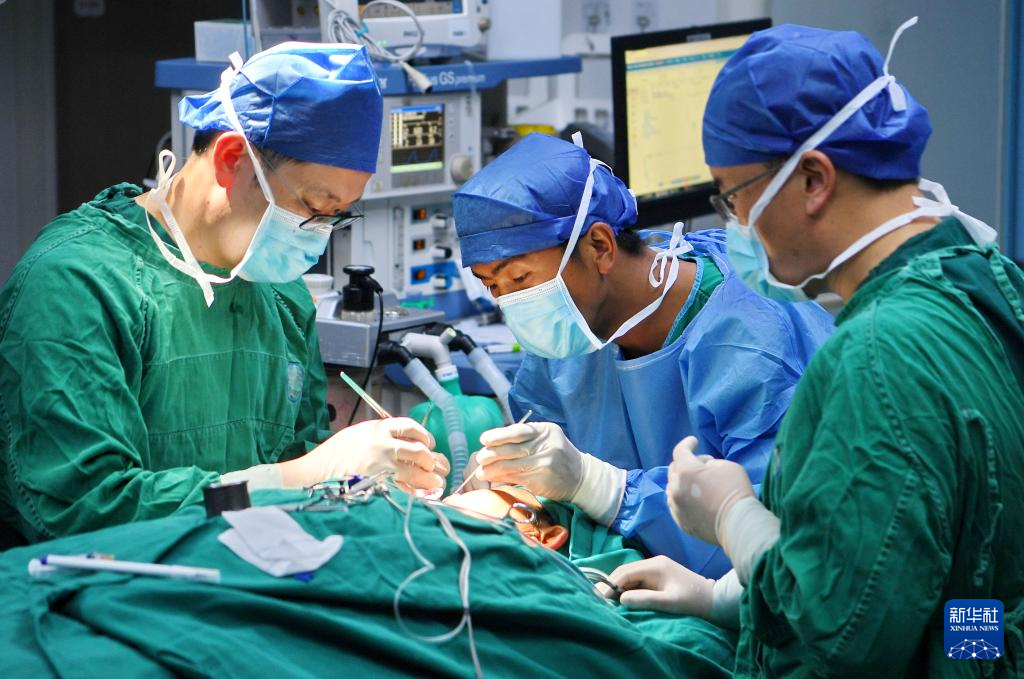 8月29日,王克明博士(左)和西藏自治區(qū)人民醫(yī)院醫(yī)生為患者實(shí)施手術(shù)。新華社記者 張汝鋒 攝