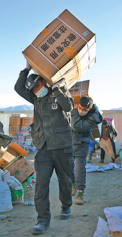 1月10日,日喀則市特警在古榮村安置點同受災(zāi)群眾一起搬運物資。人民日報記者 張武軍攝