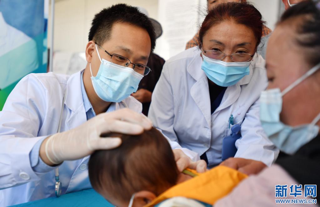 6月1日,在拉薩市人民醫(yī)院,首都兒科研究所附屬兒童醫(yī)院醫(yī)生張建昭(左)為一名藏族孩子做檢查。新華社記者 覺果 攝